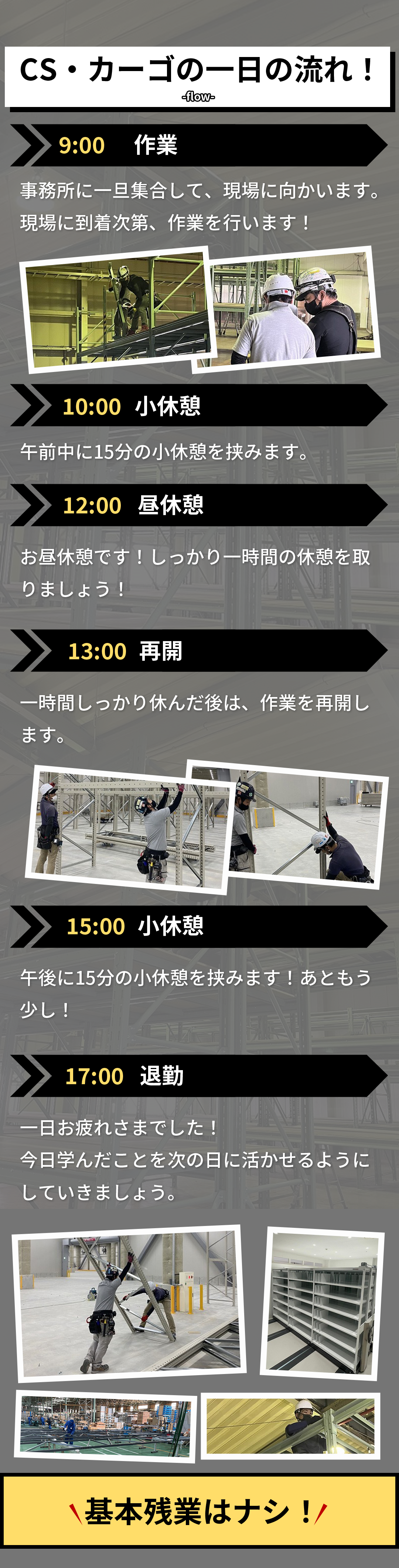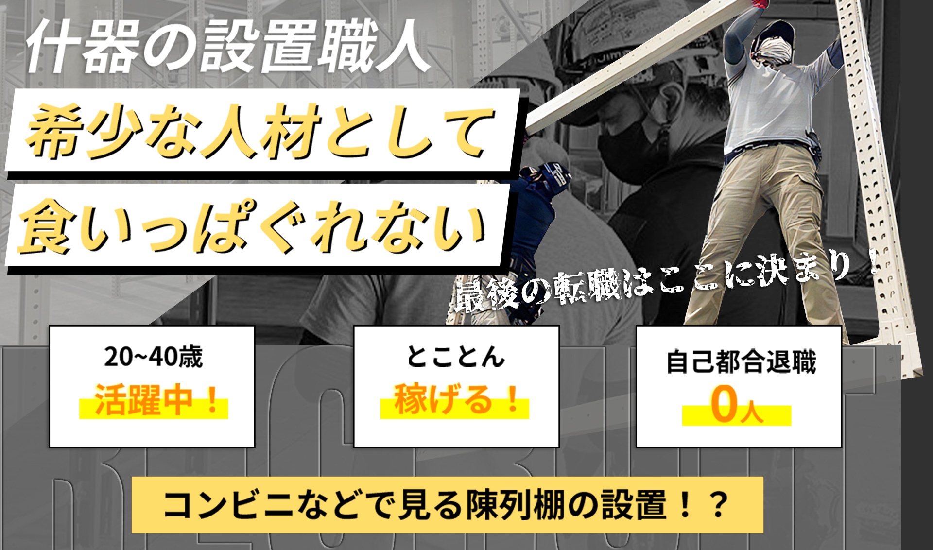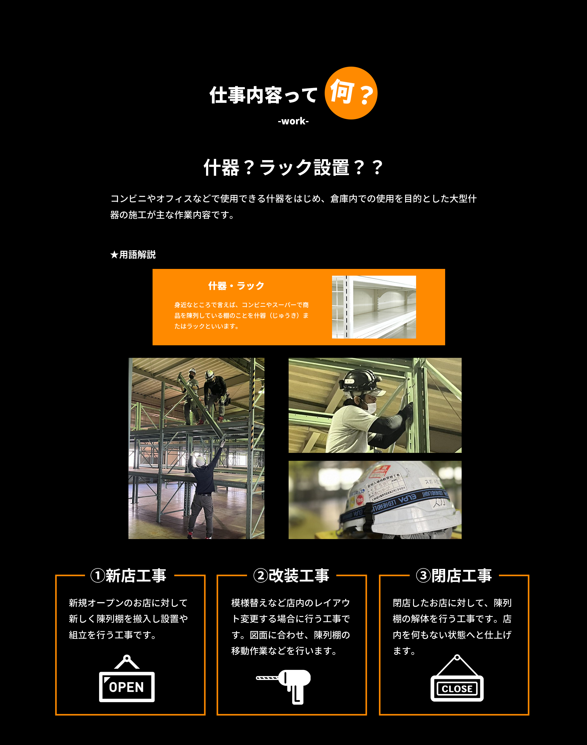| 仕事内容 | 当社の仕事は工場や物流センター内の大型棚の取付、設置や店舗やコンビニの陳列棚(什器)の設置、オフィス内の書類棚の据付、設置作業を行います。 取り扱う棚のサイズはさまざまですが、作業の基本の流れ等は変わりません。 |