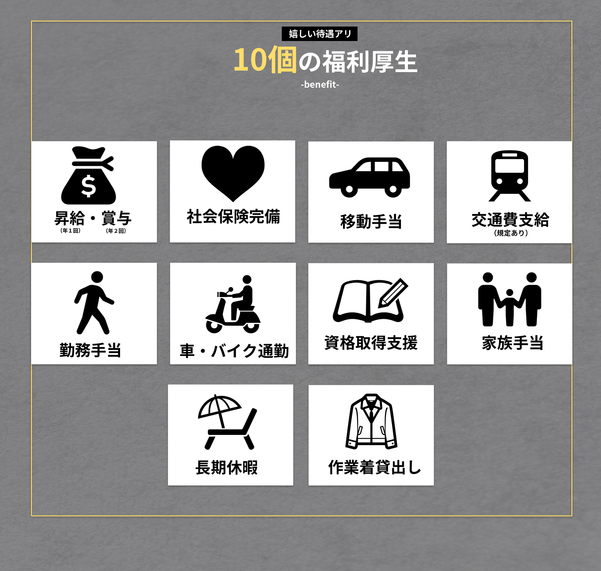 | 福利厚生 | ・昇給あり(年1回) ・賞与年2回あり ・移動手当あり ・勤務手当あり ・車・バイク通勤OK ・社会保険完備 ・資格取得支援制度あり ・家族手当 ・交通費支給(規定あり) ・作業服支給 |